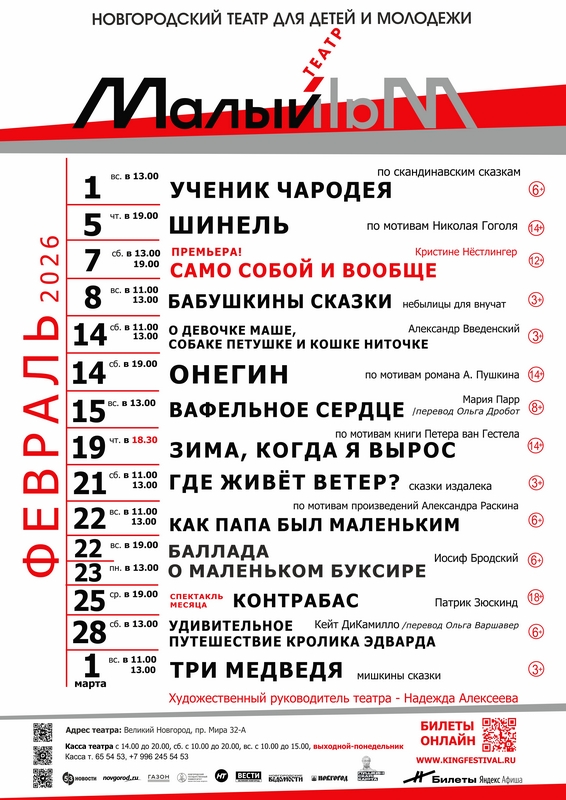 ПОДКАСТЫ: У нас появилось еще одно творческое направление: подкасты. Мы уже ставили аудиоспектакли, выпускали подкасты по Рахманинову, Пушкину, малой прозе русских писателей и народным сказкам, а в 2025 году попробовали сделать подкаст с театральными критиками во время фестиваля «Фестивальный ток», где обсуждали события и тенденции театра для молодых. А еще выпустили два важных для нас творческих подкаста: «Блокадная ласточка» по стихам Ольги Берггольц, где заслуженная артистка РФ Любовь Злобина читала знаменитые строки о войне, блокаде и великой Победе. И к 130-летию Есенина театр выпустил прекрасный и звучный подкаст «Несказанное, синее, нежное…» из 12 эпизодов-стихотворений. Послушать можно было на «Радио 53», а сейчас в ВК и на Яндекс. Подкаст.